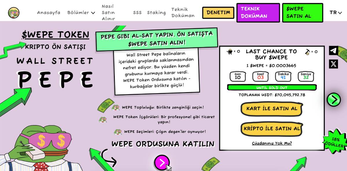Wall Street Pepe’nin ön satışı sona ermek üzereyken, yatırımcıların ilgisi her geçen gün artıyor. Geri sayım sürecinde erken yatırımcılar WEPE’yi 0,0003665 dolarlık fiyattan satın alabiliyor.